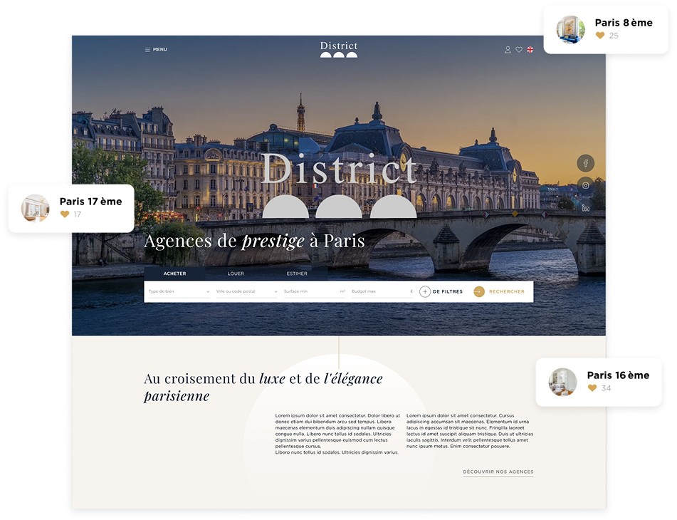 Une refonte pensée pour repositionner l'agence sur son marché. District Immo avait l'expertise, la proximité, la relation client il manquait une image digitale à la hauteur.